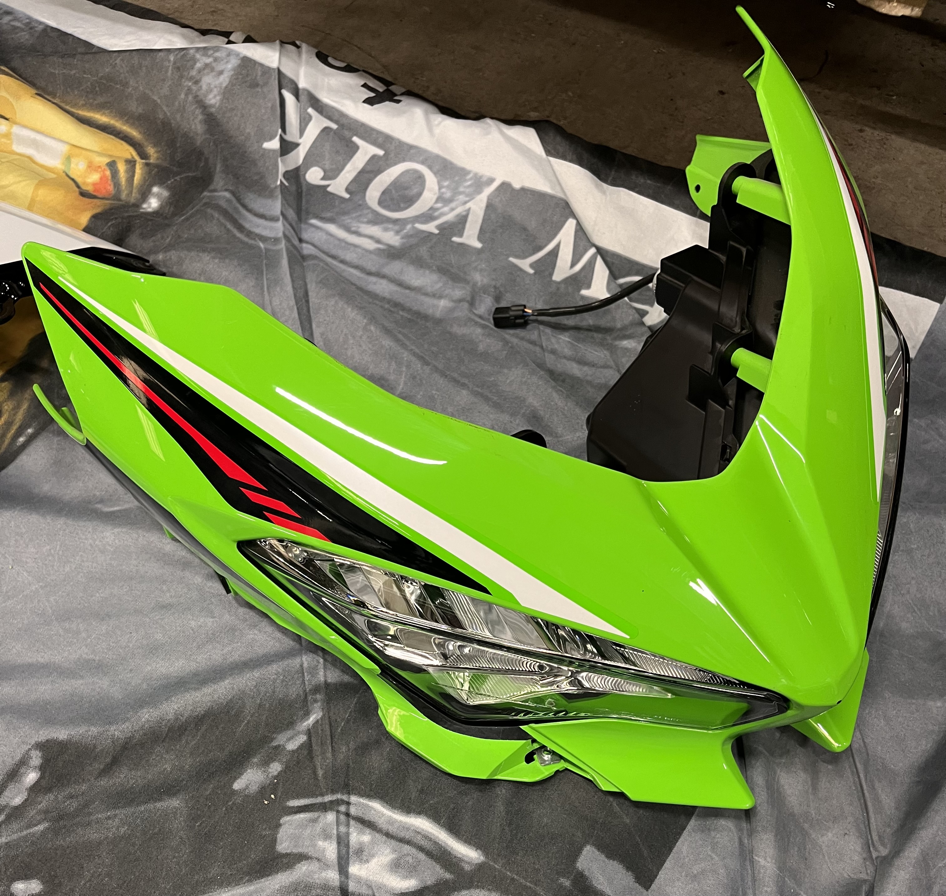 For sale: Front nose cone for Kawasaki Ninja 400 in good condition, including lamp unit. Finished in the Kawasaki KRT color scheme (original kawasaki part)
